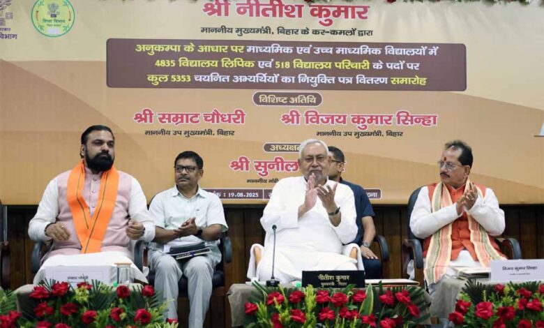 मुख्यमंत्री नीतीश कुमार ने आज मुख्यमंत्री सचिवालय स्थित 'संवाद' में अनुकंपा के आधार पर माध्यमिक एवं उच्च माध्यमिक विद्यालयों में 4835 विद्यालय लिपिक एवं 518 विद्यालय परिचारी के पदों पर चयनित कुल 5353 अभ्यर्थियों को नियुक्ति पत्र प्रदान किया। इस दौरान मुख्यमंत्री ने सांकेतिक रूप से मणि कुमारी,अमित गौरव, दिव्या राज, किरण कुमारी गुप्ता एवं तूबा अशरफ को नियुक्ति पत्र प्रदान किया। इस दौरान मुख्यमंत्री ने कहा कि सभी नवनियुक्त कर्मियों को मेरी हार्दिक बधाई एवं शुभकामनाएं है। मुझे विश्वास है कि सभी नवनियुक्त कर्मी पूरी ईमानदारी और निष्ठा के साथ अपने कर्तव्यों का निर्वहन करेंगे।