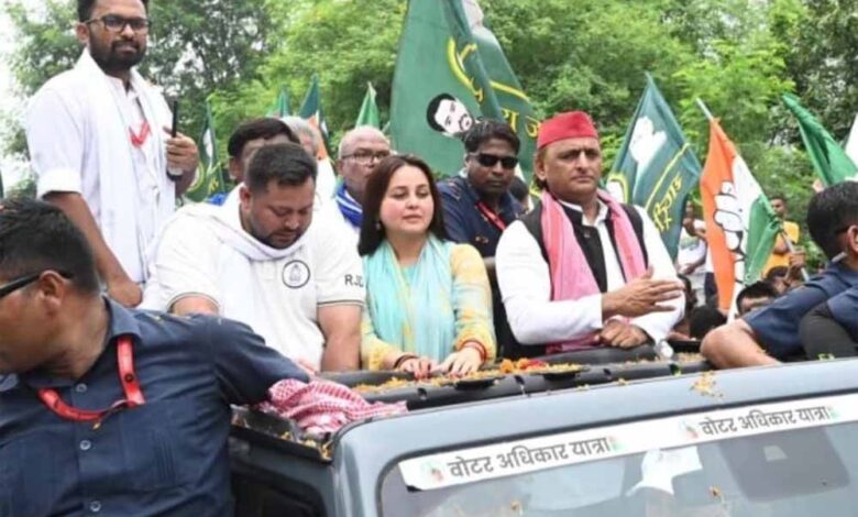 बिहार में एसआईआर के खिलाफ जारी राहुल गांधी की वोटर अधिकार यात्रा में शनिवार को सपा अध्यक्ष और यूपी के पूर्व सीएम अखिलेश यादव शामिल हुए। यात्रा के 14वें दिन आरा में जनसभा को अखिलेश यादव ने संबोधित करते हुए मोदी सरकार पर जमकर निशाना साधा। सपा अध्यक्ष ने बीजेपी, सरकार और अधिकारियों को चुनावी 'तीन तिगाड़ा' बताते हुए कहा कि इन्हें इंडिया गठबंधन तोड़ेगा। अखिलेश ने कहा कि अवध से हम लोगों ने बीजेपी को भगाया है, अब मगध से भाजपा को भगाने की जिम्मेदारी आप लोगों की है।