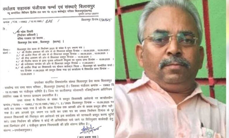 बिलासपुर प्रेस क्लब के निर्वाचन 2025 को लेकर चुनाव अधिकारी महेश तिवारी पर गंभीर लापरवाही के आरोप लगे हैं। सहायक पंजीयक, फर्म्स एवं संस्थाएं बिलासपुर ने जारी पत्र में स्पष्ट किया है कि निर्वाचन संबंधी मामले में प्रस्तुत शिकायतों पर चुनाव अधिकारी की ओर से समय-सीमा में जवाब नहीं दिया गया।