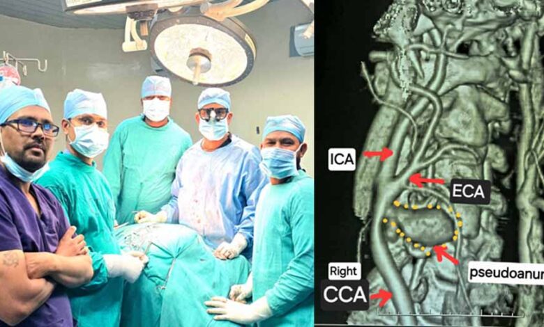 गर्दन के नसों की सीटी एंजियोग्राफी जांच में यह चौंकाने वाला तथ्य सामने आया कि मरीज की दायीं कैरोटिड आर्टरी फट चुकी है और उसके चारों ओर गुब्बारानुमा संरचना बन गई है, जिसे कैरोटिड आर्टरी स्यूडोएन्युरिज्म (Carotid Artery Pseudoaneurysm) कहा जाता है। स्थिति की गंभीरता को देखते हुए मरीज को तत्काल हार्ट, चेस्ट एवं वैस्कुलर सर्जरी विभाग में में डॉ कृष्ण कांत साहू के पास भेजा गया।
