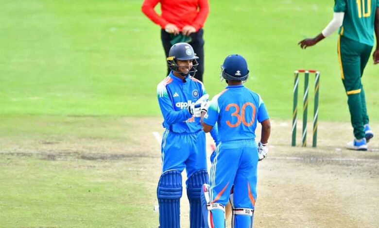 यूथ ओडीआई सीरीज में भारत और दक्षिण अफ्रीका के बीच तीसरा मुकाबला बुधवार को बेनोनी में खेला जा रहा है। भारत ने तीसरे मुकाबले में पहले बल्लेबाजी करते हुए अच्छी शुरुआत की है। भारत को वैभव सूर्यवंशी के रूप में पहला झटका लगा। वैभव 74 गेंद में 127 रन बनाकर आउट हुए। उन्होंने अपनी पारी में 9 चौके और 10 छक्के लगाए। वैभव और आरोन के बीच पहले विकेट के लिए 154 गेंद में 227 रन की साझेदारी हुई। आरोन जॉर्ज 106 गेंद में 118 रन बनाकर आउट हुए। वेदांत 43 गेंद में 34 रन बनाकर आउट हुए। हरवंश रन आउट हुए। अभिज्ञान कुंडू ने 20 गेंद में 21 रन बनाए। कनिष्क 10 और एम्ब्रिश 8 रन बनाकर आउट हुए।