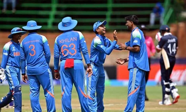 अदनित 18 रन बनाकर पवेलियन लौटे, जबकि नीतीश ने 52 गेंदों में 4 चौकों के साथ 36 रन बनाए, लेकिन टीम चुनौतीपूर्ण स्कोर तक पहुंचा नहीं सके। भारत की तरफ से हेनिल पटेल ने 7 ओवरों में महज 16 रन देकर 5 विकेट हासिल किए, जबकि दीपेश देवेंद्रन, आरएस अंबरीश, खिलन पटेल और वैभव सूर्यवंशी ने 1-1 विकेट हासिल किया।