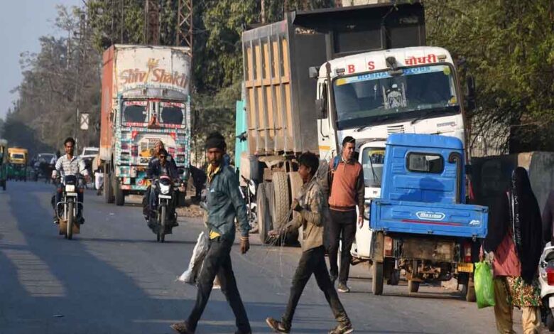 सर्विस लेन पर भारी वाहन खड़े, शहर में यातायात हुआ बाधित