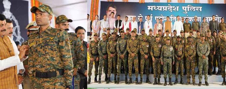 मुख्यमंत्री डॉ मोहन यादव नक्सली मुठभेड़ में अदम्य साहस दिखाने वाले 60 जवानों को क्रम से पूर्व पदोन्नति देने के लिए कार्यक्रम में पहुंचे।