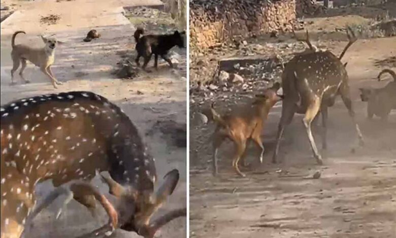 हिरण को कुत्तों से घिरा देख बच्चों ने शोर मचाया