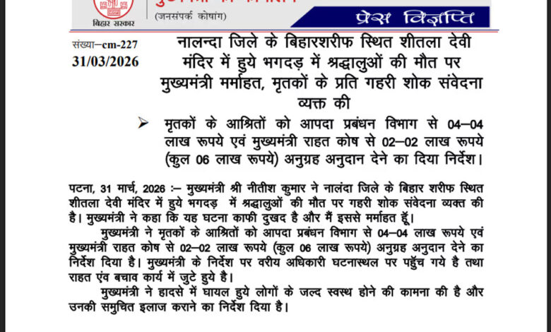 हादसे की खबर मिलते ही मुख्यमंत्री नीतीश कुमार ने गहरी शोक संवेदना व्यक्त की है. मुख्यमंत्री ने कहा कि वह इस घटना से अत्यंत मर्माहत हैं और उन्होंने तुरंत राहत कार्यों में तेजी लाने के निर्देश दिए हैं. नीतीश कुमार ने मृतकों के आश्रितों के लिए कुल 6 लाख रुपये के अनुग्रह अनुदान की घोषणा की है, जिसमें 4 लाख रुपये आपदा प्रबंधन विभाग और 2